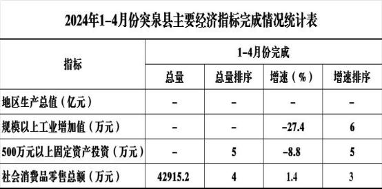 2024 年 1-4 月份突泉县规模以上工业增加值,同比下降27.4%,增速在全盟6个旗县市中排第6位(全盟增速5.6%)。