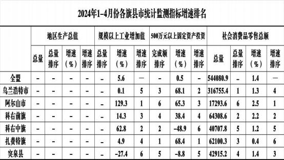 2024 年 1-4 月份突泉县社会消费品零售总额 42915.2万元,同比增长1.4%,增速在全盟6个旗县市中排第3位(全盟增速 1.4%)。