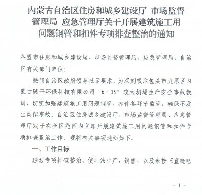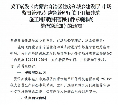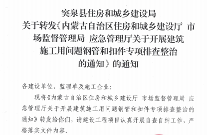 突泉县住房和城乡建设局关于转发《内蒙古自治区住房和城乡建设厅 市场监督管理局 应急管理厅关于开展建筑施工用问题钢管和扣件专项排查整治的通知》的通知