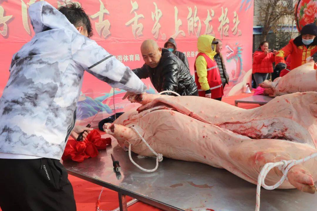 随后,村民们齐心协力把身披红绸的全猪抬上到舞台中央后,伴随着喜庆的音乐,卸猪比赛开始了,有“大力士”一边挥舞着菜刀一边吆喝,也有“技巧大人”利用巧劲将猪“大卸八块”,观众发出持续的震撼声……大家如此“卖力”不仅仅是为了赛后丰厚的奖品,更是共同感受着传统节日的独特魅力,释放无限活力。