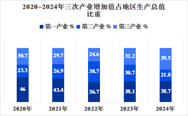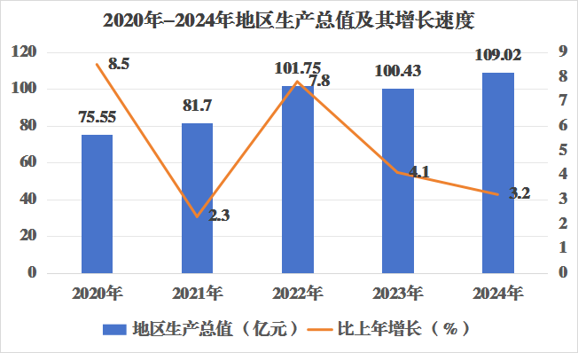 初步核算,2024年全县地区生产总值109.02亿元,按可比价计算,比上年增长3.2%。其中,第一产业增加值42.20亿元,比上年增长5.4%;第二产业增加值23.77亿元,比上年下降6.1%;第三产业增加值43.05亿元,比上年增长5.7%。第一产业增加值占地区生产总值的比重为38.7%,第二产业增加值占地区生产总值的比重为21.8%,第三产业增加值占地区生产总值的比重为39.5%。