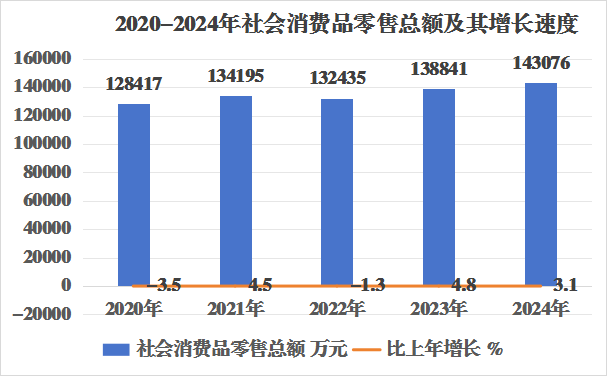 全年社会消费品零售总额14.31亿元,比上年增长3.1%。批发和零售业实现增加值5.85亿元,比上年下降0.2%。住宿和餐饮业实现增加值8744万元,比上年增长2.6%。