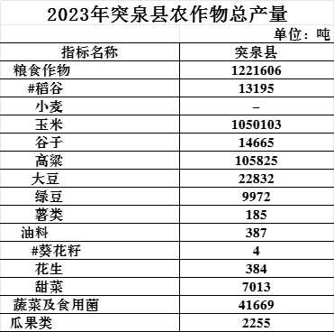 全年粮食作物产量1221605.89吨,比上年增长1.01%。其中,谷物产量1186307.18吨,比上年增长0.48%;玉米产量1050102.51吨,比上年增长2.81%;高粱产量105825.15吨,比上年下降17.21%;豆类产量35113.66吨,比上年增长23.90%;薯类产量185.04吨,比上年下降54.78%。蔬菜及食用菌产量41669吨。