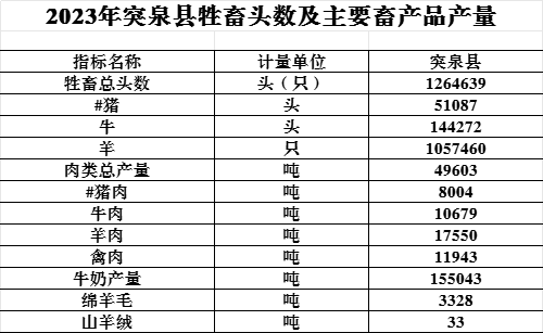 全年肉类总产量49603吨。其中,猪肉产量8004吨,牛肉产量10679吨,羊肉产量17550吨,禽肉产量11943吨。禽蛋产量10933吨;牛奶产量155043吨;绵羊毛产量3328吨;山羊绒产量33吨。