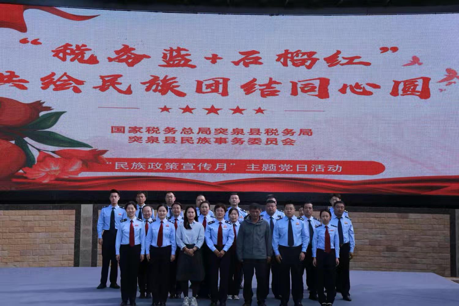 为进一步铸牢中华民族共同体意识,全面加强党的民族理论政策和法律法规宣传教育,5月19日,突泉县民族事务委员会联合税务局开展“税务蓝+石榴红”系列活动,覆盖各族干部群众100余人。