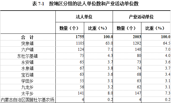 在第二产业和第三产业法人单位中,位居前三位的乡镇是:突泉镇1105个,占63.0%;太平乡法人单位141个,占8.0%;六户镇法人单位124个,占7.1%。按地区分组的单位情况详见表7-1。