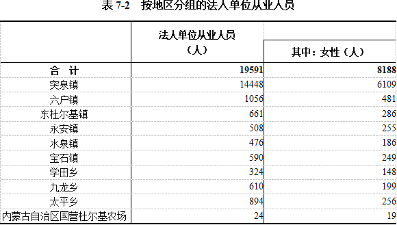 在法人单位从业人员中,位居前三位的乡镇是:突泉镇14448人,占73.7%;六户镇1056人,占5.4%;太平乡894人,占4.6%。按地区分组的法人单位从业人员情况详见表7-2。