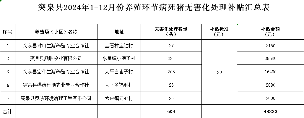 按照《农业农村部关于进一步加强病死动物无害化处理监管工作的通知》(农医发〔2012〕12号)、内蒙古自治区兽医局(关于进一步加强生猪规模养殖场病死猪无害化处理补助相关工作的通知》(内牧医函〔2017〕10号)文件要求,现将2024年1-12月期间发生的养殖环节病死猪无害化处理政策补贴资金进行公示。