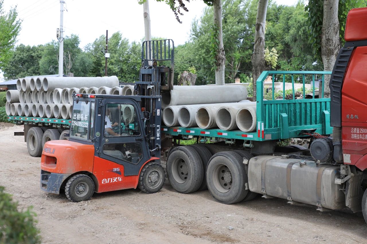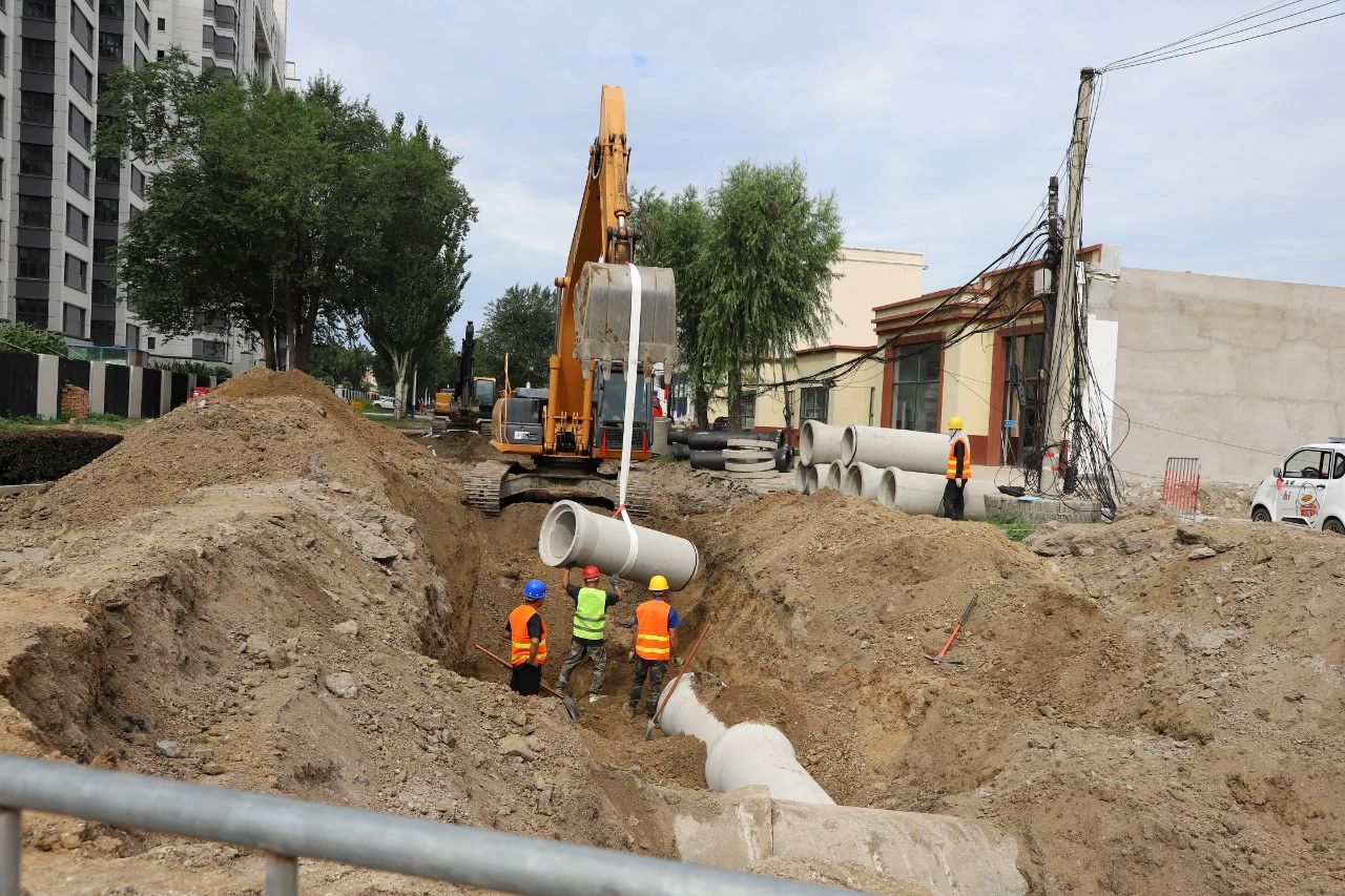 在突泉县利群街管网改造施工现场,机器轰鸣,工人们正紧张有序地将一根根雨污水管道从运输车上卸下,尽管施工任务繁重,但工人们始终保持着高效的工作节奏,力争在最短时间内完成管道铺设,减少对居民出行的影响。
