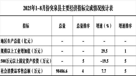 2025年1-8月份突泉县规模以上工业增加值,同比增长29.5%,增速在全盟6个旗县市中排第1位。(全盟增速6.7%)