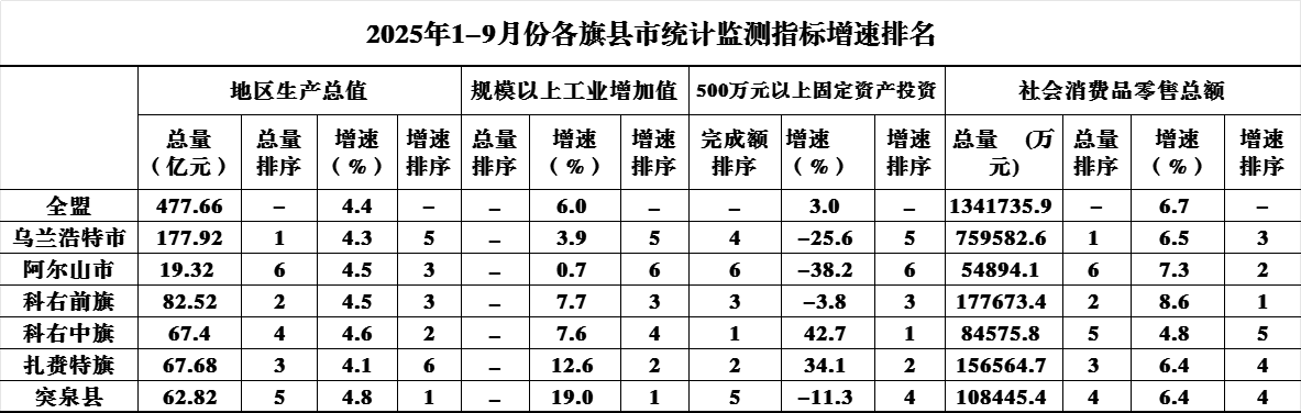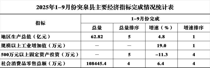 2025年1-9月份突泉县规模以上工业增加值,同比增长19.0%,增速在全盟6个旗县市中排第1位。(全盟增速6.0%)