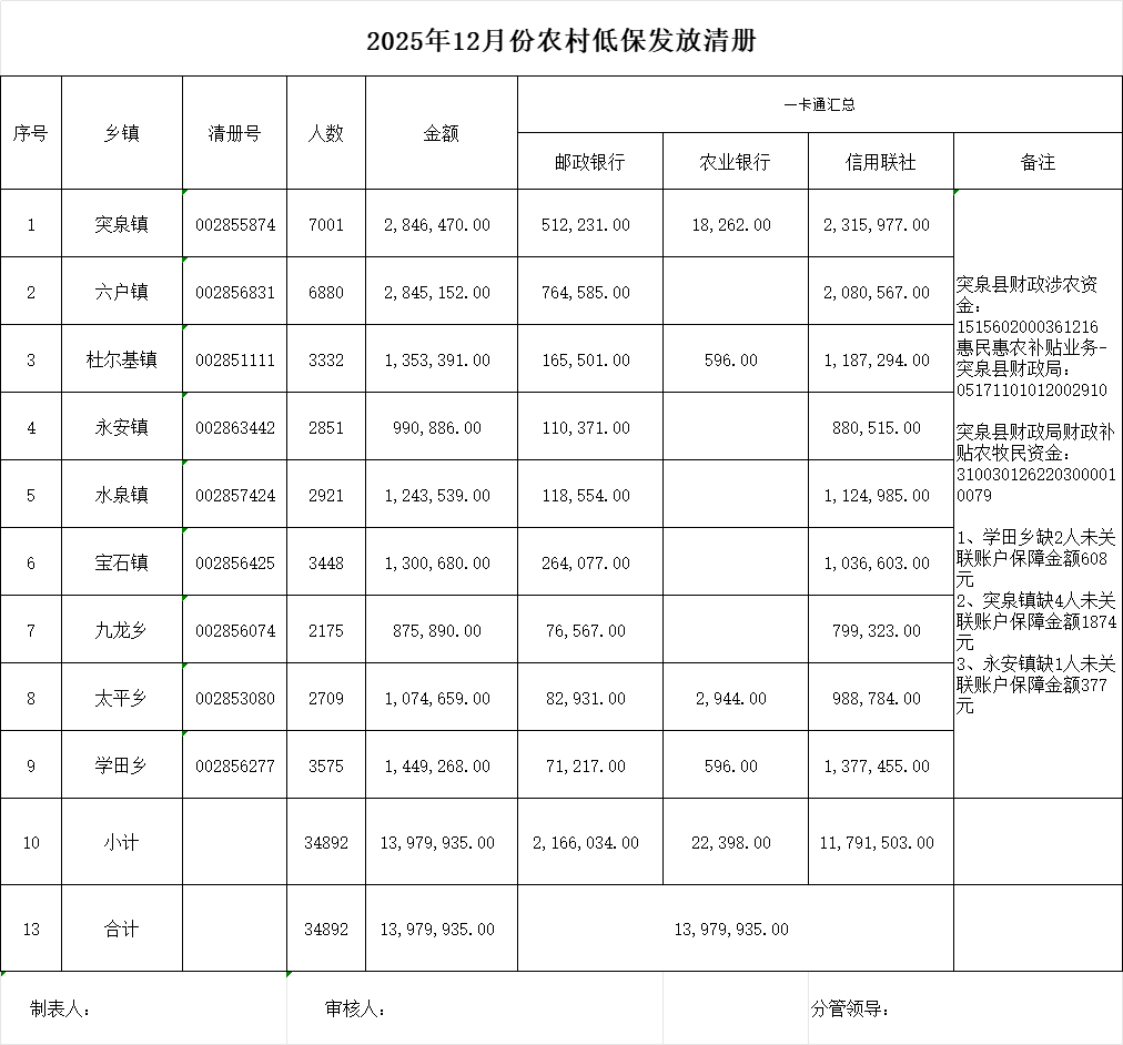 2025年12月份城乡低保发放明细