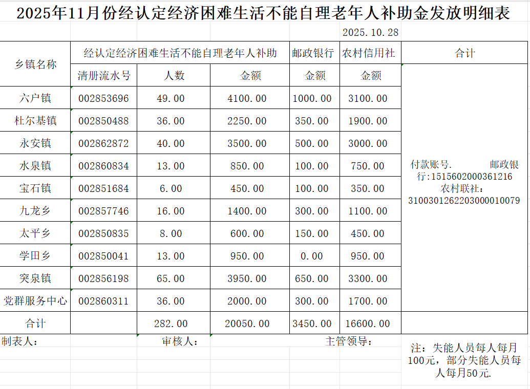 【老年人补贴】2025年11月份经认定经济困难生活不能自理老年人补助金发放明细表