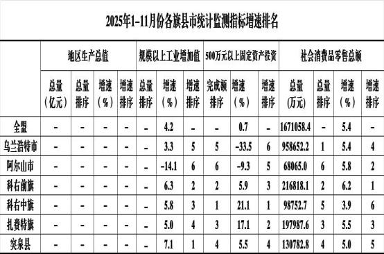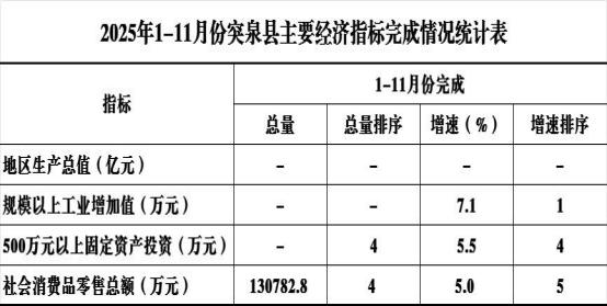 2025年1-11月份突泉县规模以上工业增加值,同比增长7.1%,增速在全盟6个旗县市中排第1位。(全盟增速4.2%)