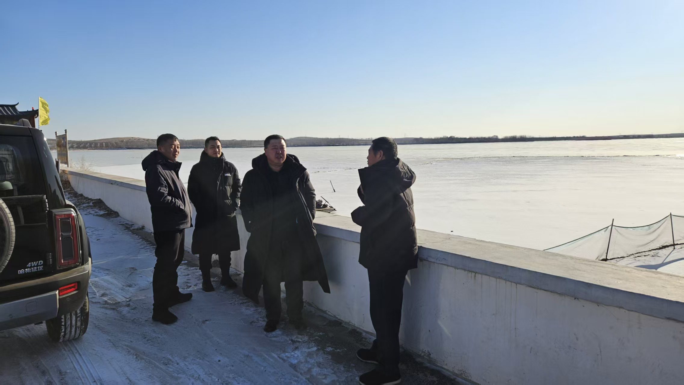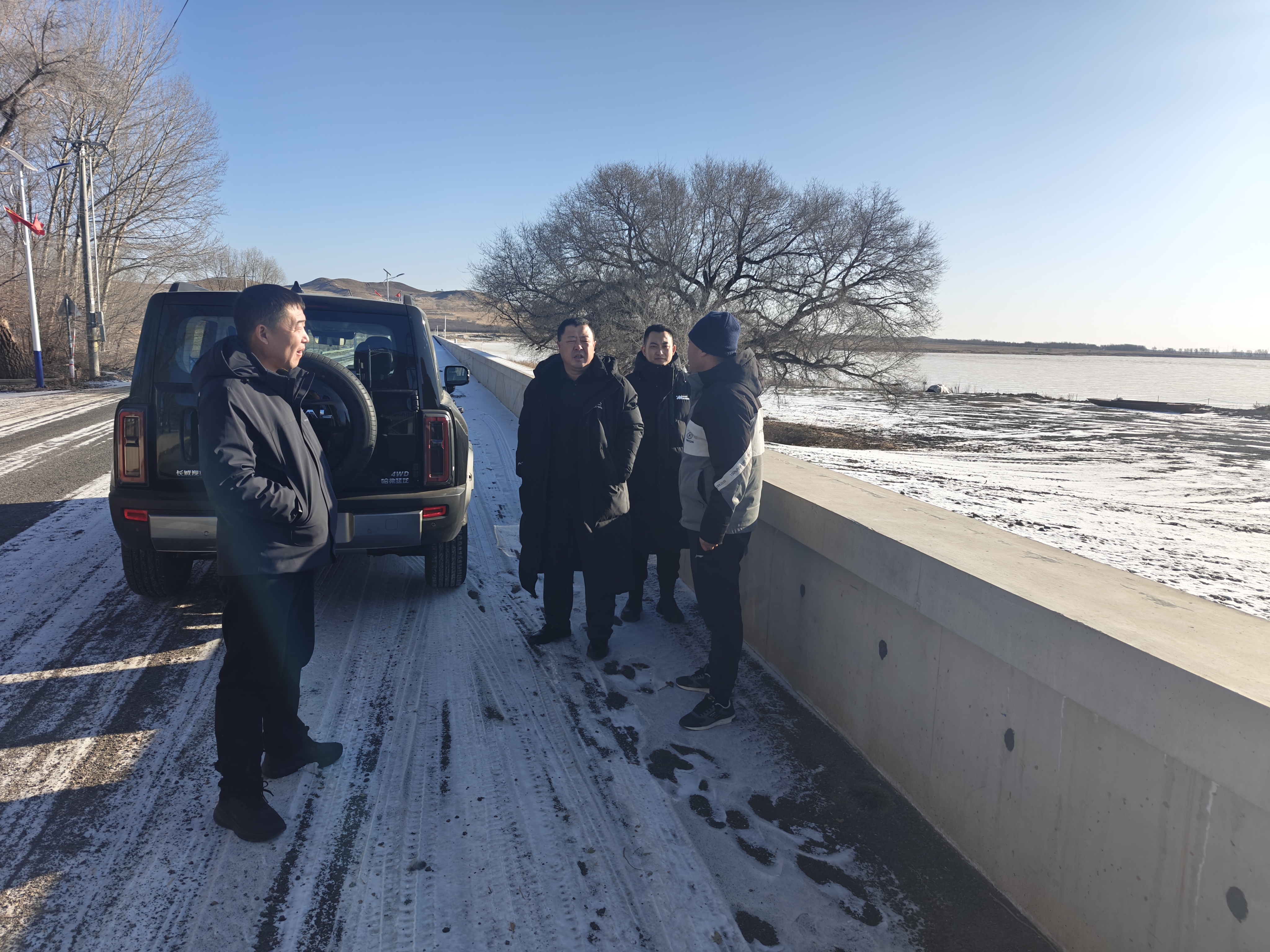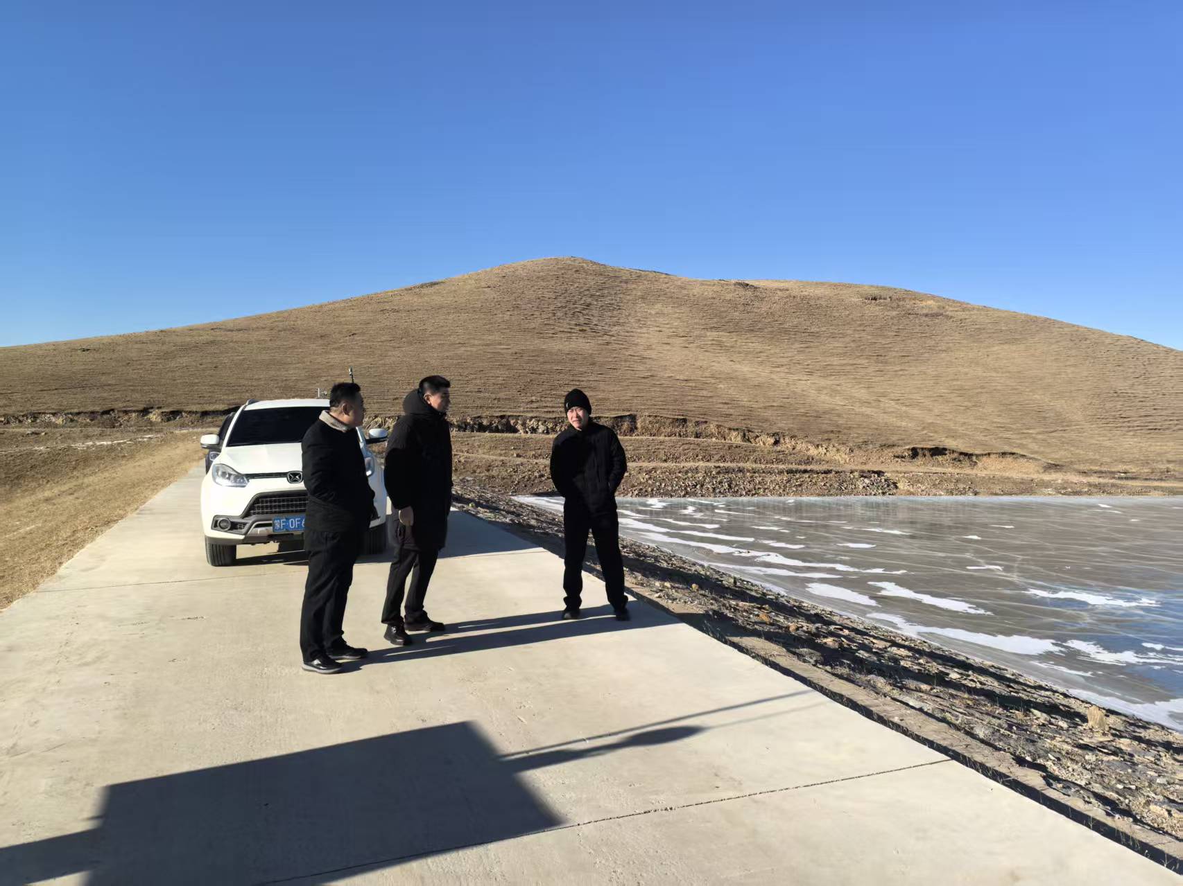 水库事务服务中心贾久成主任、张明泽副主任带队前往大青山水库,现场检查安全生产工作落实情况,并就冰面安全警示标志布设细节进行针对性指导。