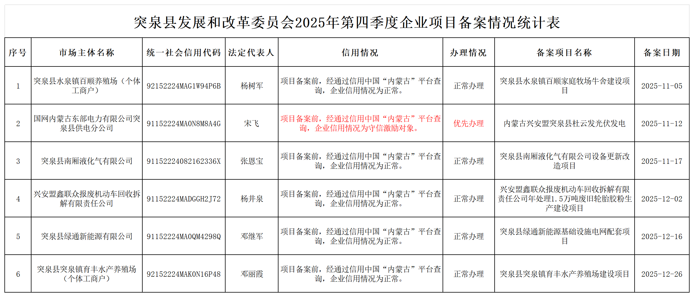现将突泉县发展和改革委员会2025年第四季度企业项目备案情况统计表予以公示。