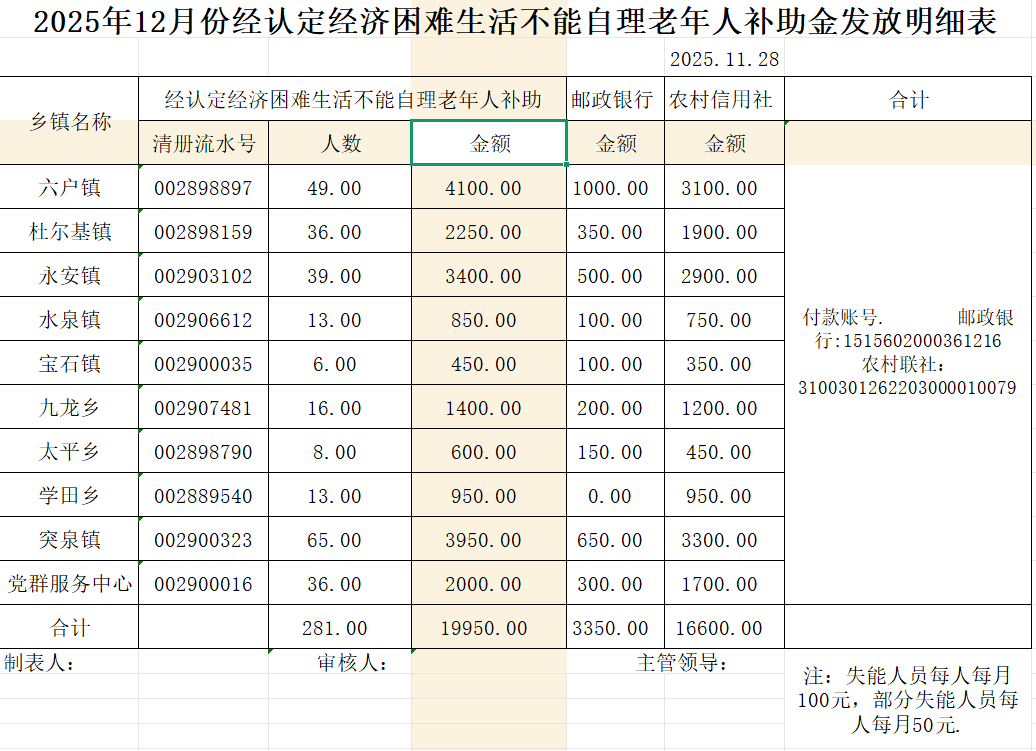 【老年人补贴】2025年12月份经认定经济困难生活不能自理老年人补助金发放明细表