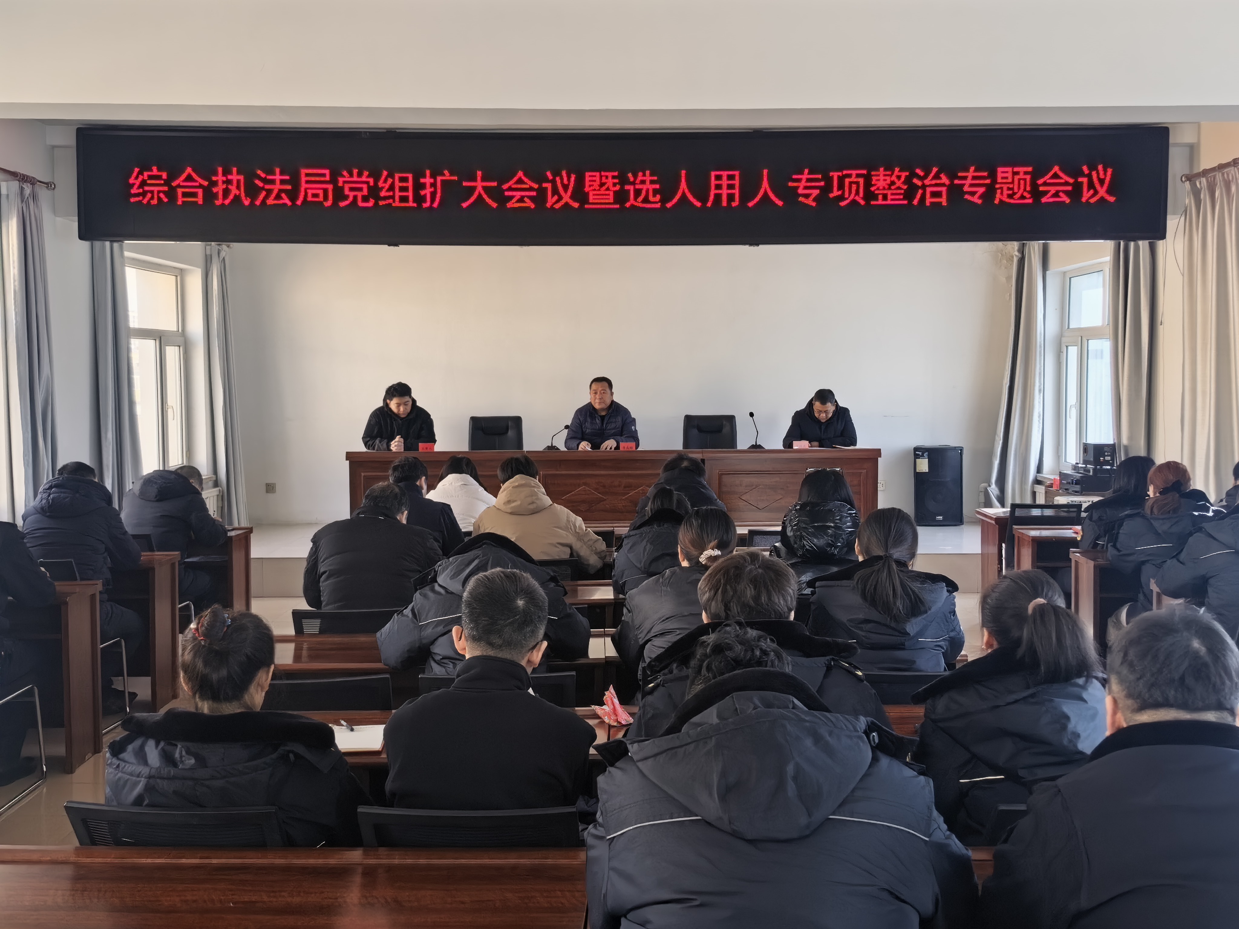 党组扩大会议暨选人用人专项整治专题会议聚焦全面从严治党和干部队伍建设。会议传达学习了上级关于选人用人工作的重要指示精神,对全局选人用人专项整治工作进行了周密部署。会议强调,要严格落实党管干部原则,坚持德才兼备、以德为先、任人唯贤的用人导向,坚决整治选人用人中的不正之风,着力打造一支忠诚干净担当的高素质执法队伍,为执法工作提供坚强的组织保障。